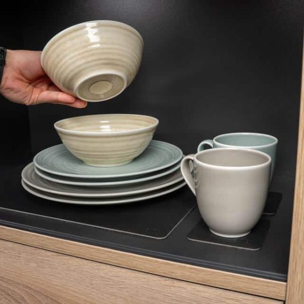 - La vaisselle est empilable pour un gain de place et sans cliquetis